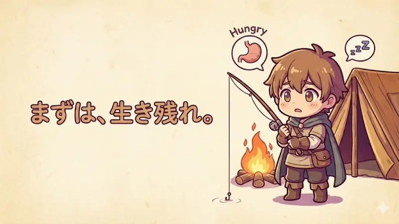 序盤は拠点の外へ遠出すると、餓死や過労のリスクが跳ね上がります。移動距離がそのまま死亡率に直結することを意識し、まずは「野原」での自給自足体制を整えましょう。