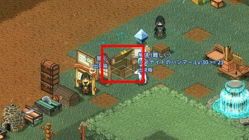 また、クエスト「はじめての出荷箱」に沿って出荷箱を作り設置することで、拾った装備や加工品を即座にオレン(通貨)へ変換できるようになり、金策の速度が一段上がります。*画像の赤線で囲んだものが出荷箱です。